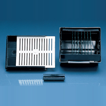 Slide staining kit (one rack + one jar) simplifies the staining of standard sized slides (76 x 26 mm). The staining rack holds 25 slides, and the staining jar can also be used as a storage box for 25 slides.